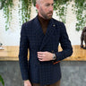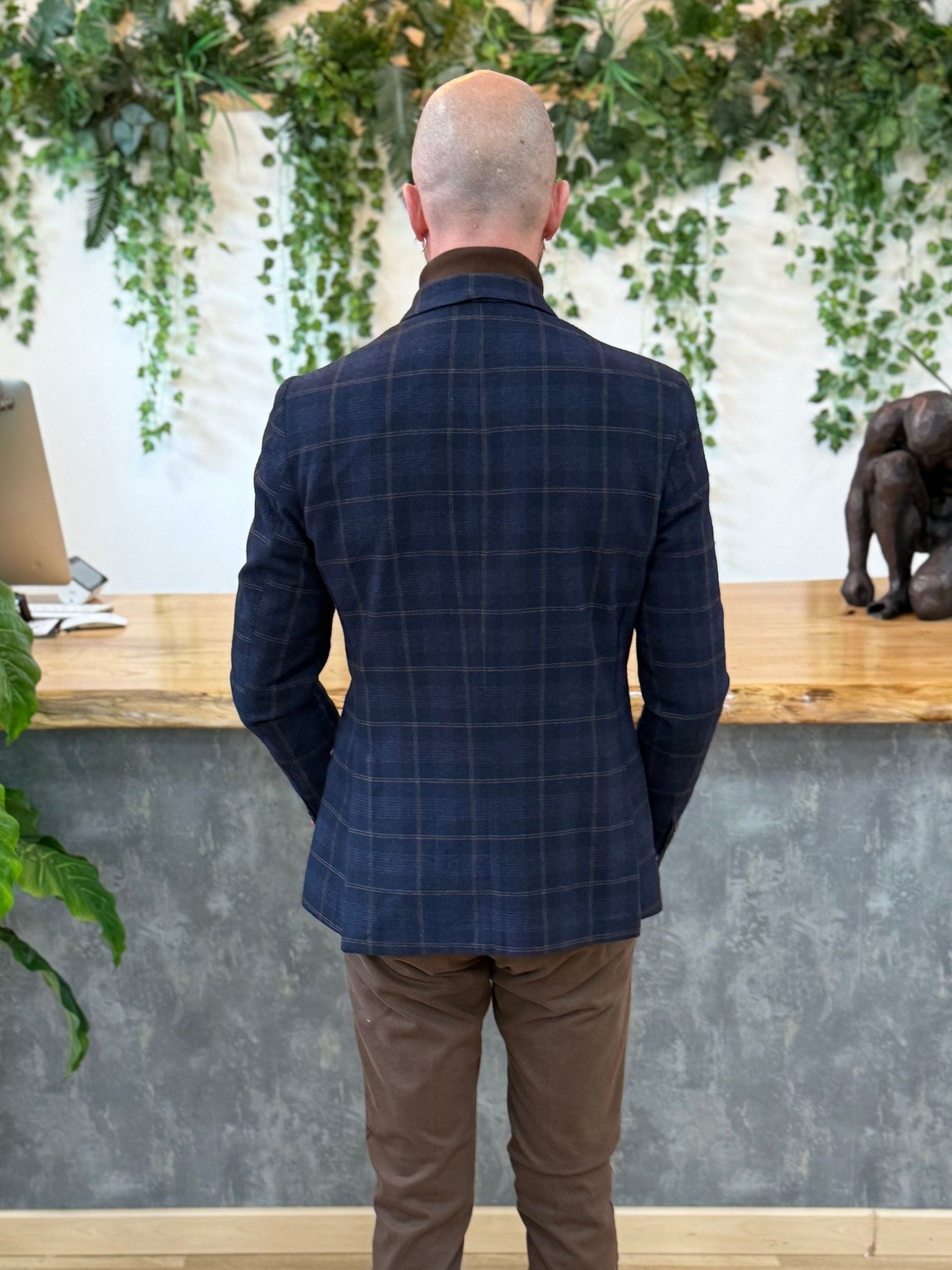 - Giacca doppiopetto a quadri in tessuto misto lana con chiusura a sei bottoni, rever classico e tasche con pattina.