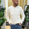 - Maglioncino girocollo con lavorazione a treccia tono su tono e taschino applicato con dettaglio a contrasto.