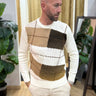 - Maglione girocollo con lavorazione geometrica a blocchi nei toni caldi del cammello, marrone e panna.