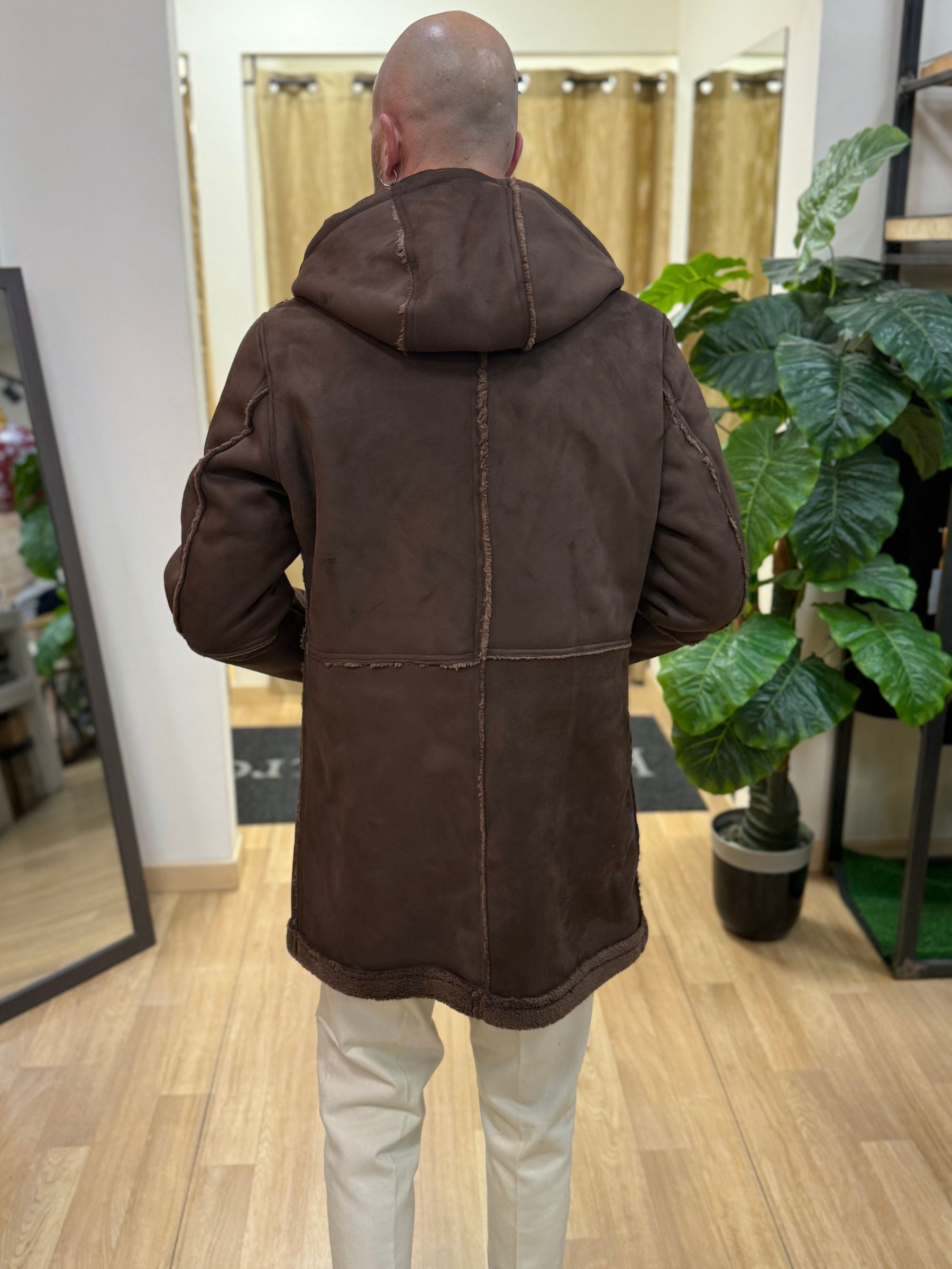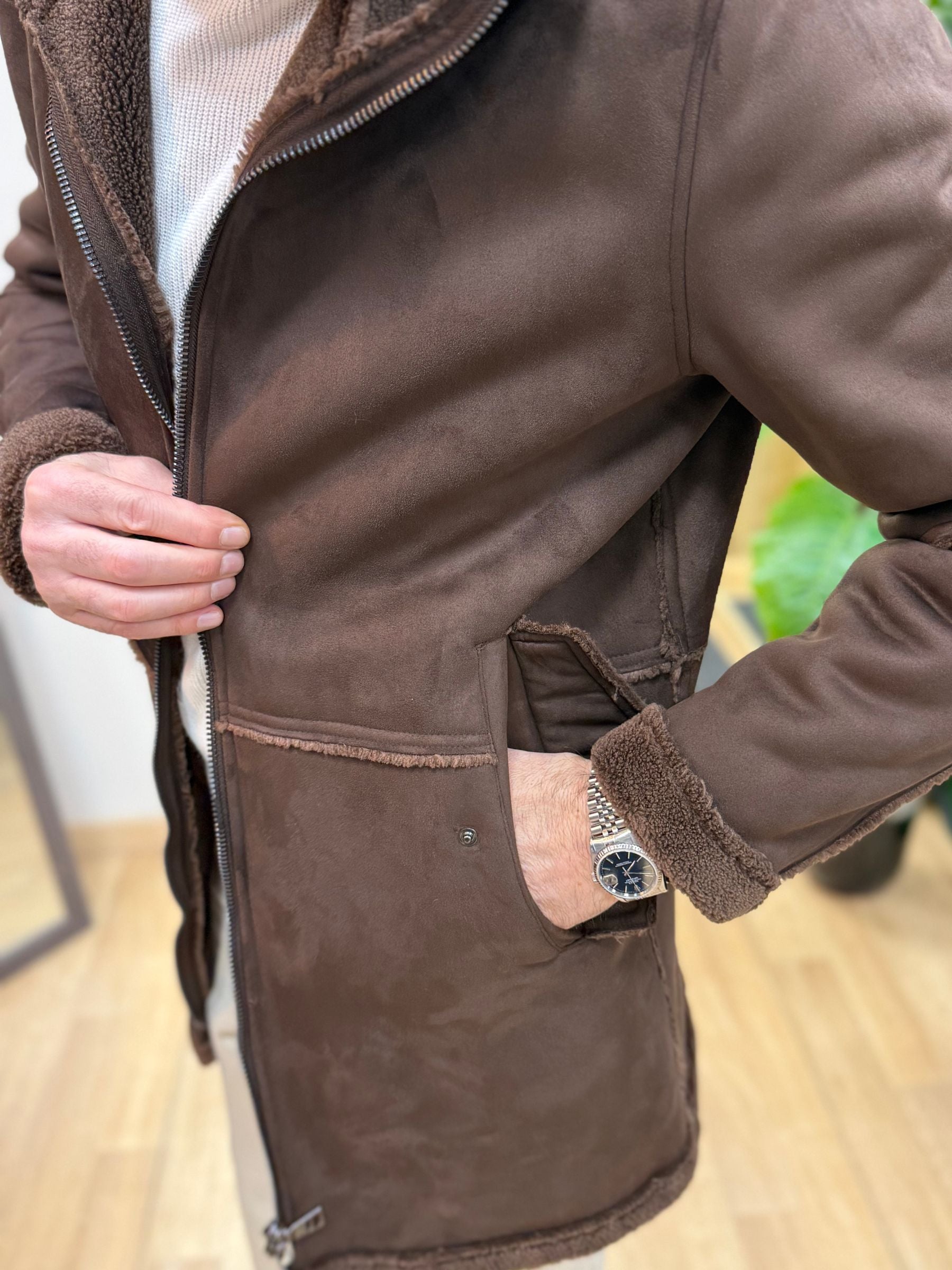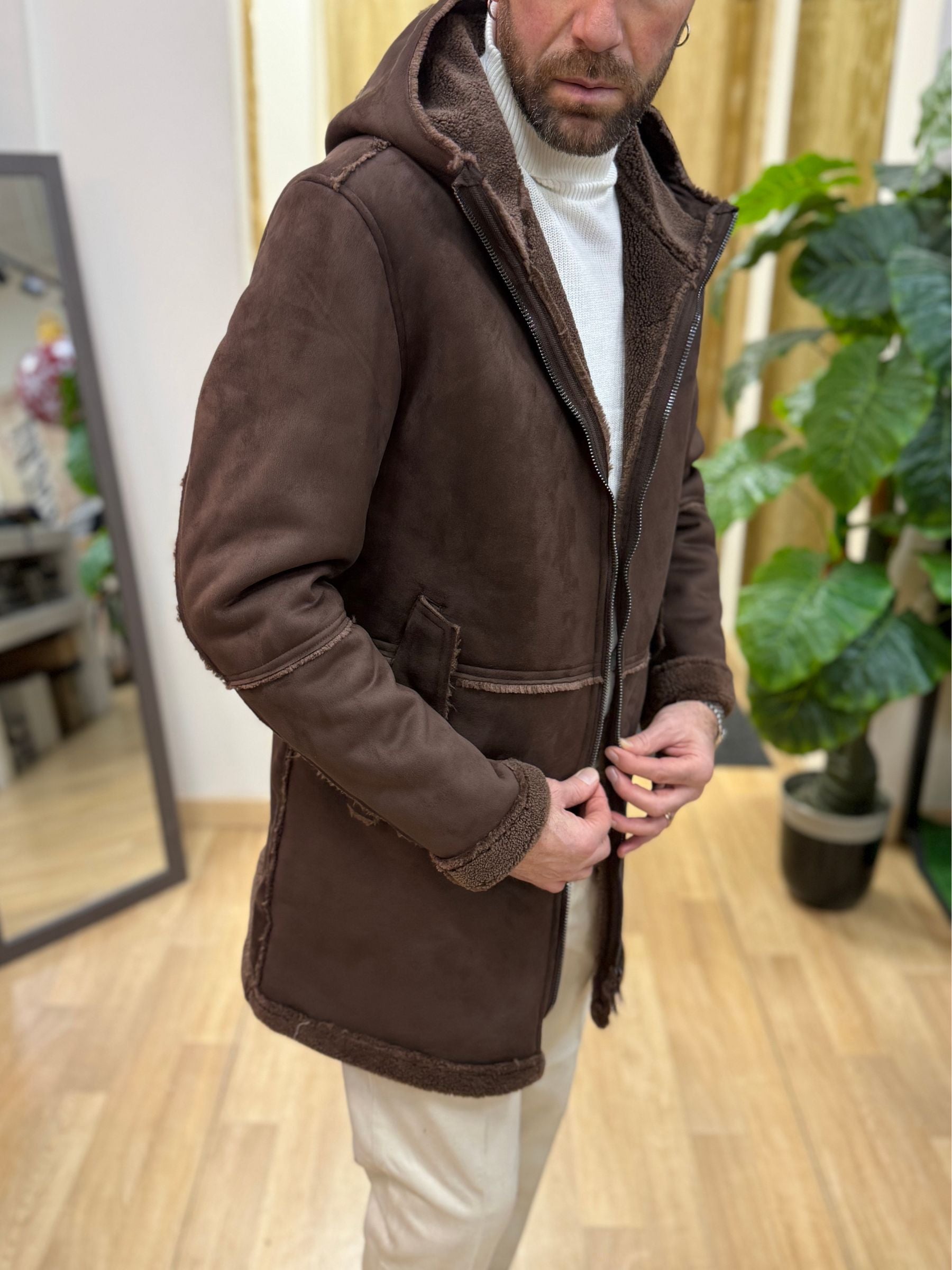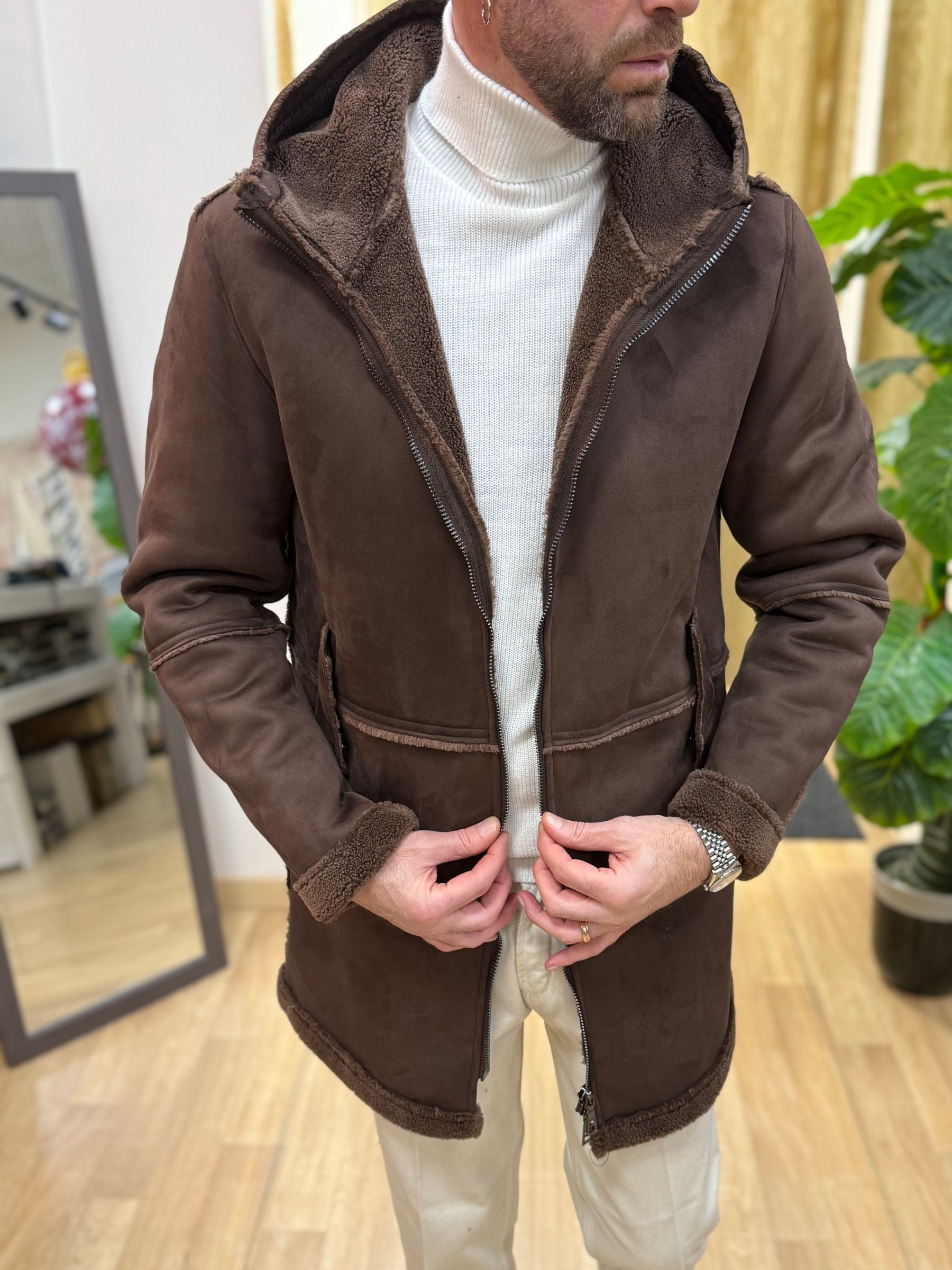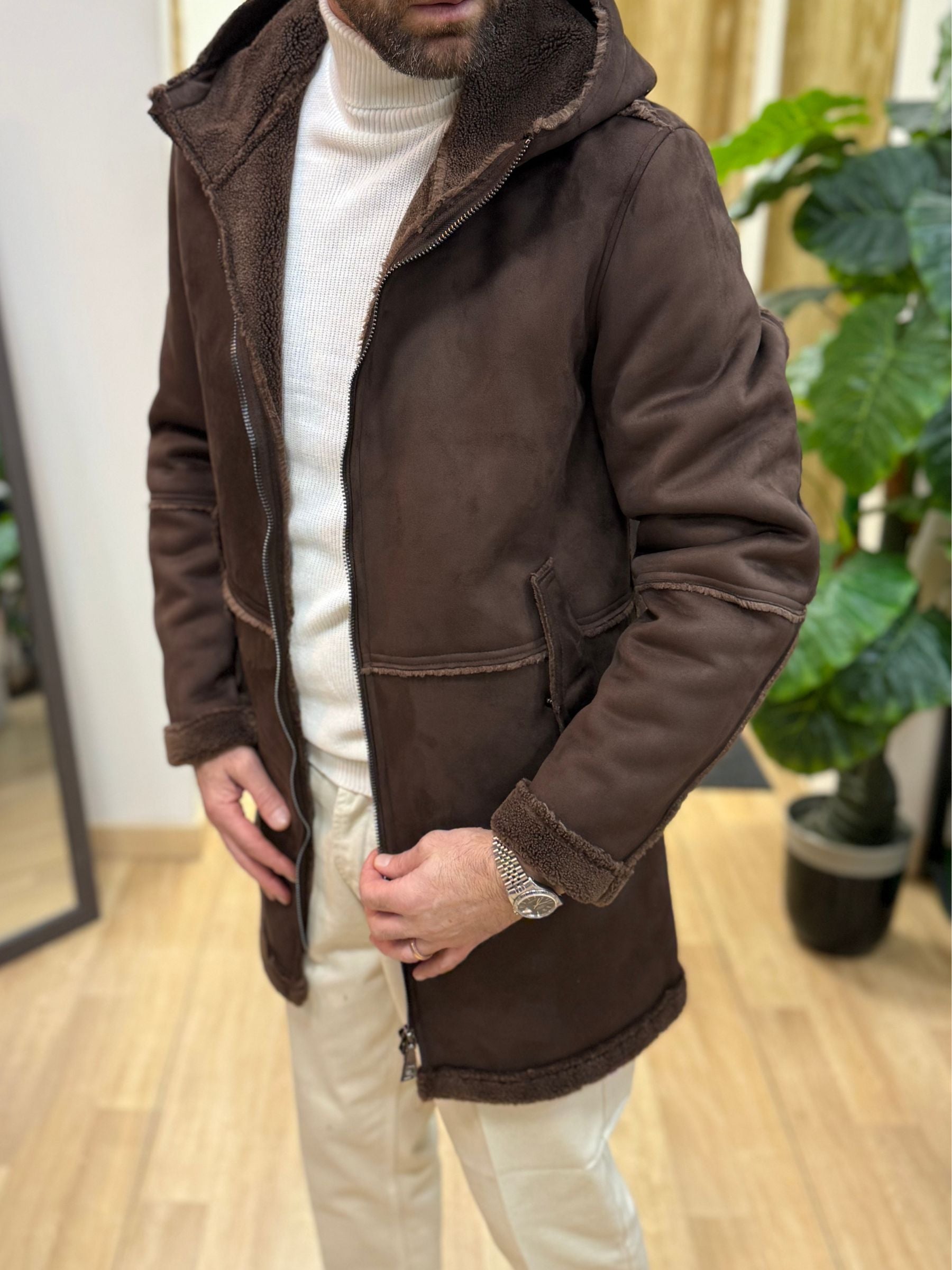 • Giacca parka in eco montone effetto suede, con interno teddy effetto pelliccia tono su tono.