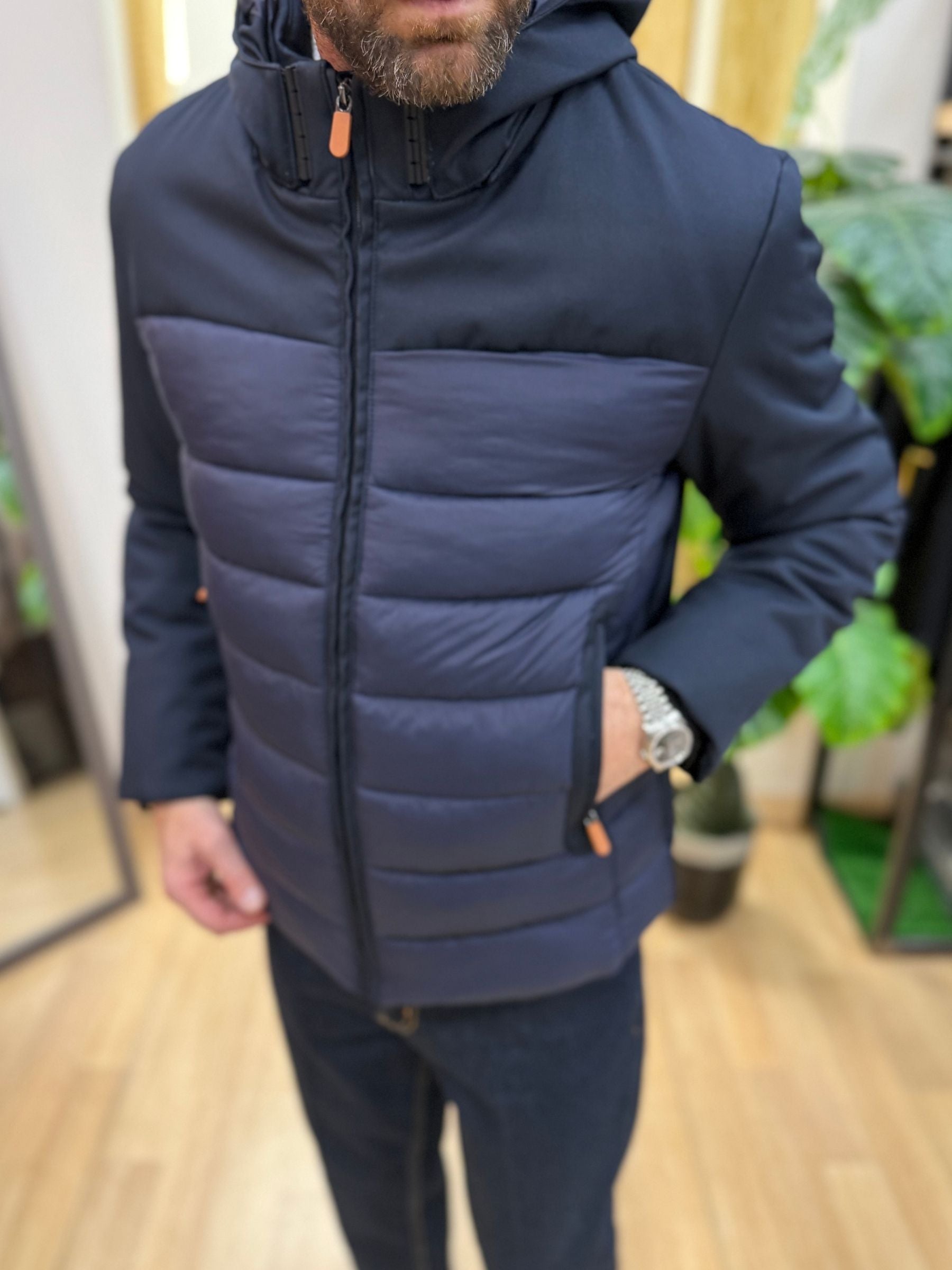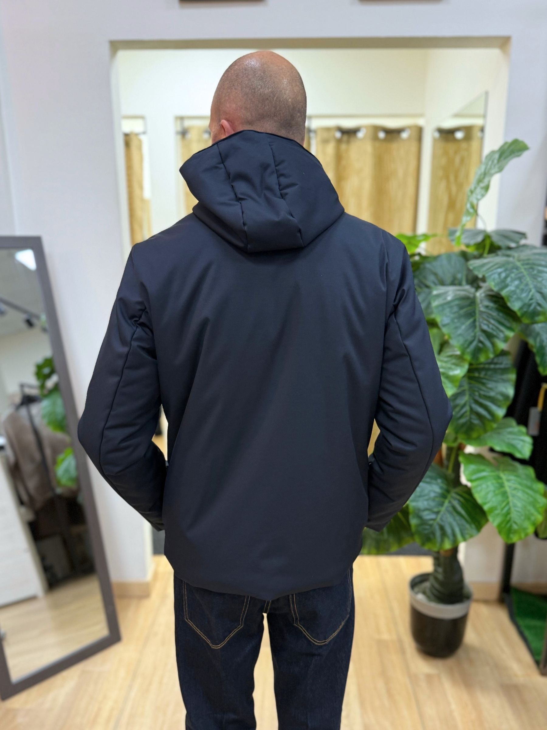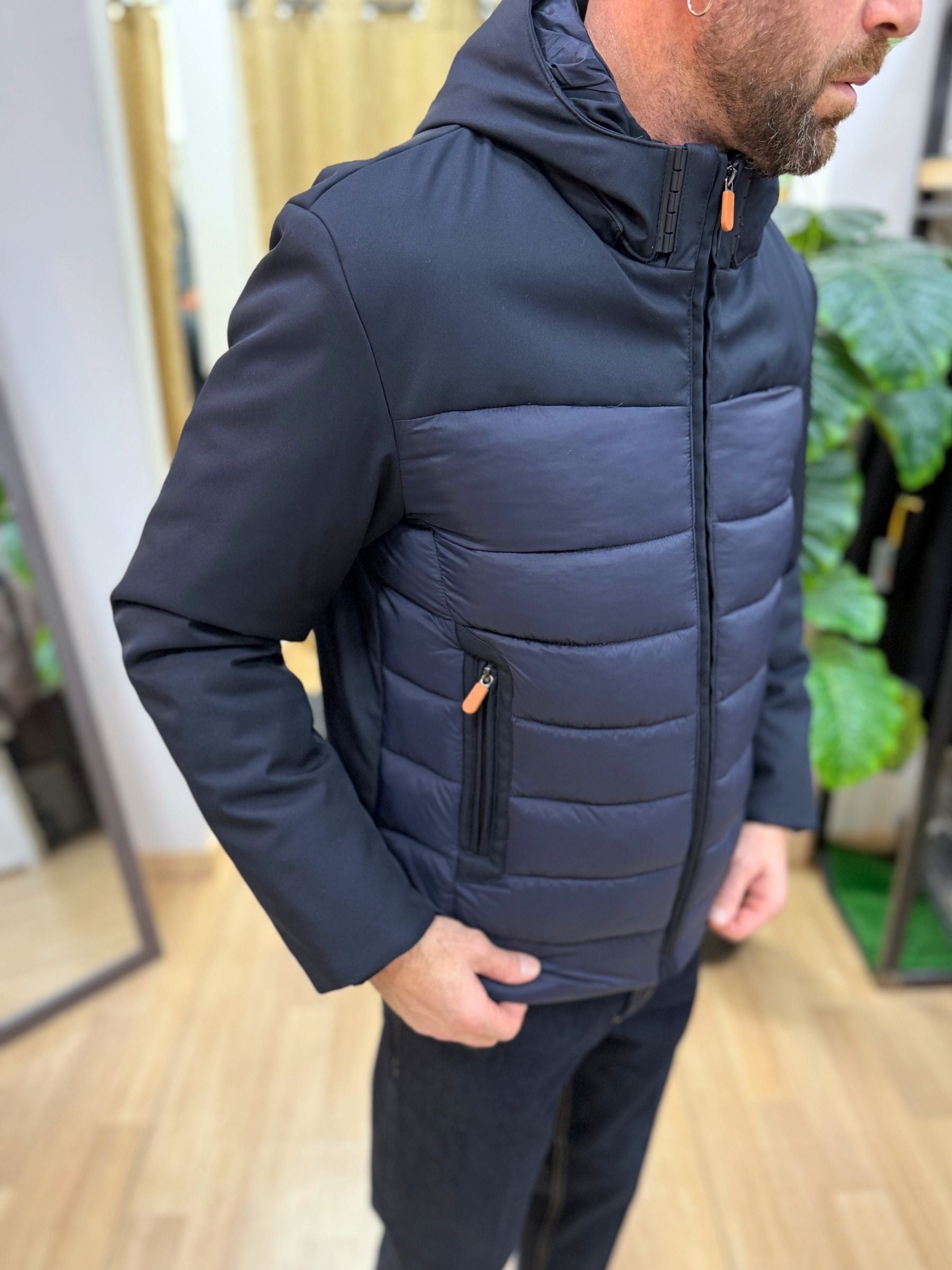 - Giaccone in tessuto tecnico imbottito con interno caldo e confortevole.