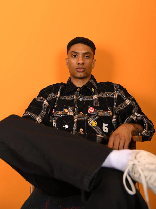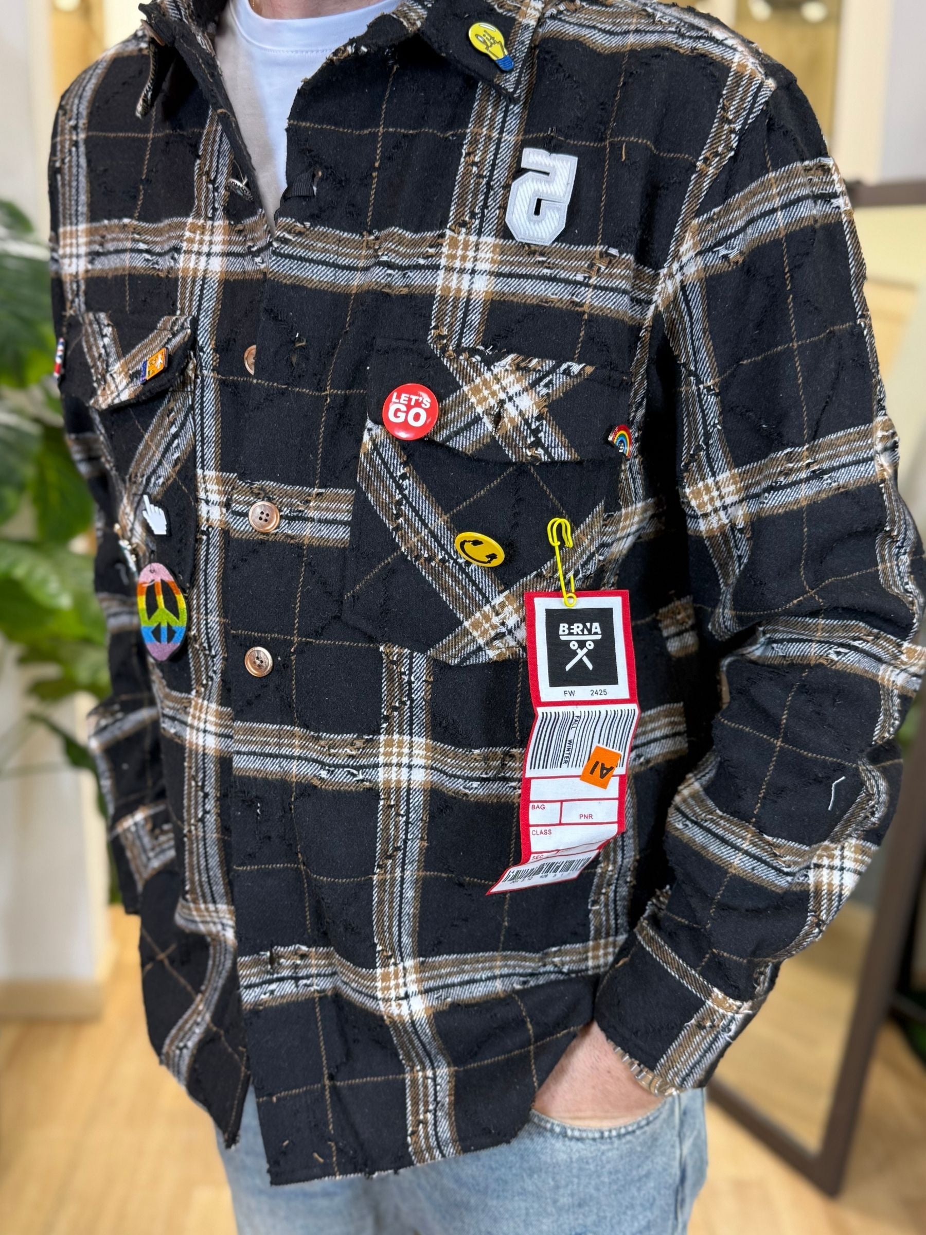 - Colore: Nero con pattern check beige e dettagli distressed;