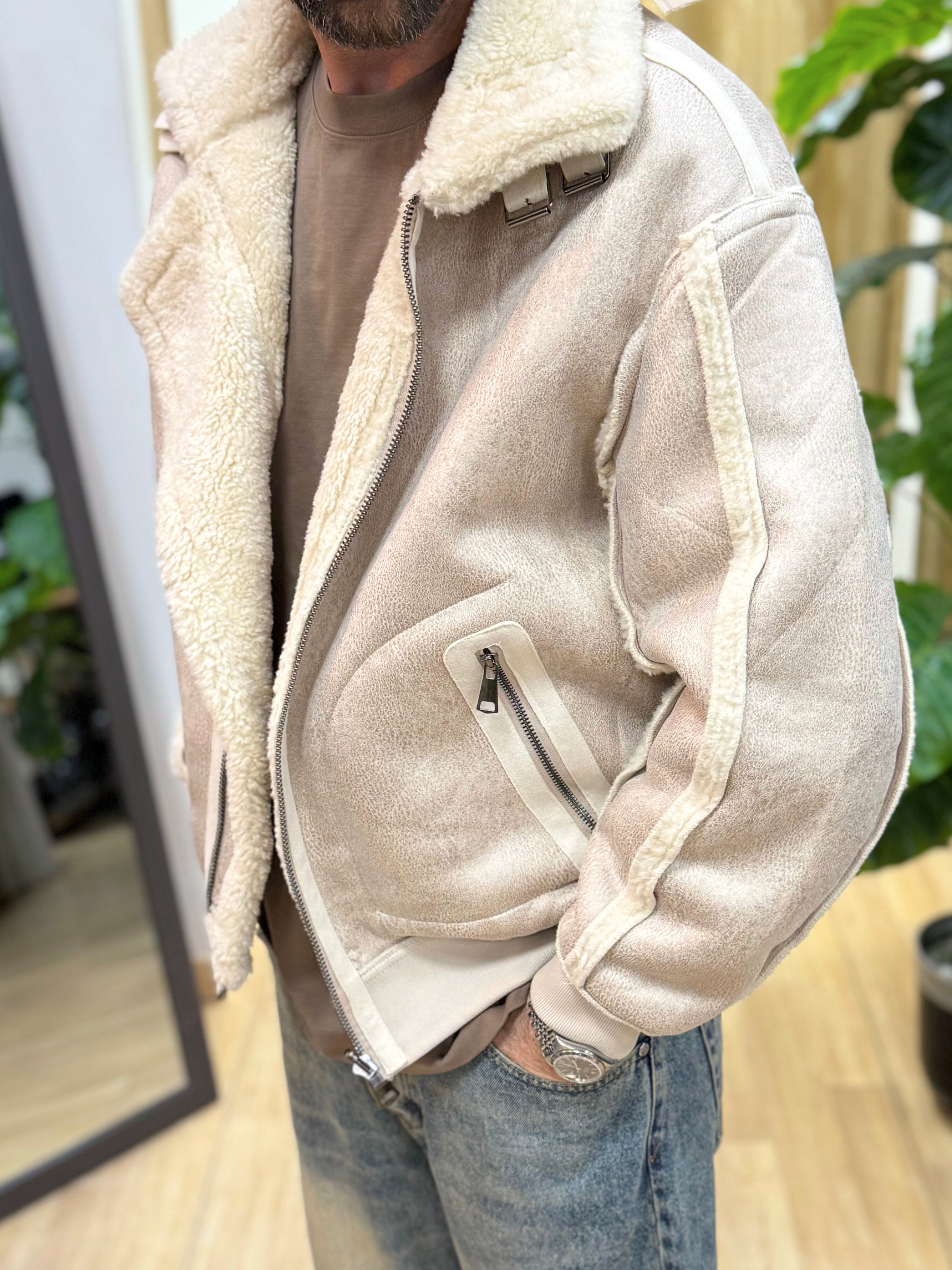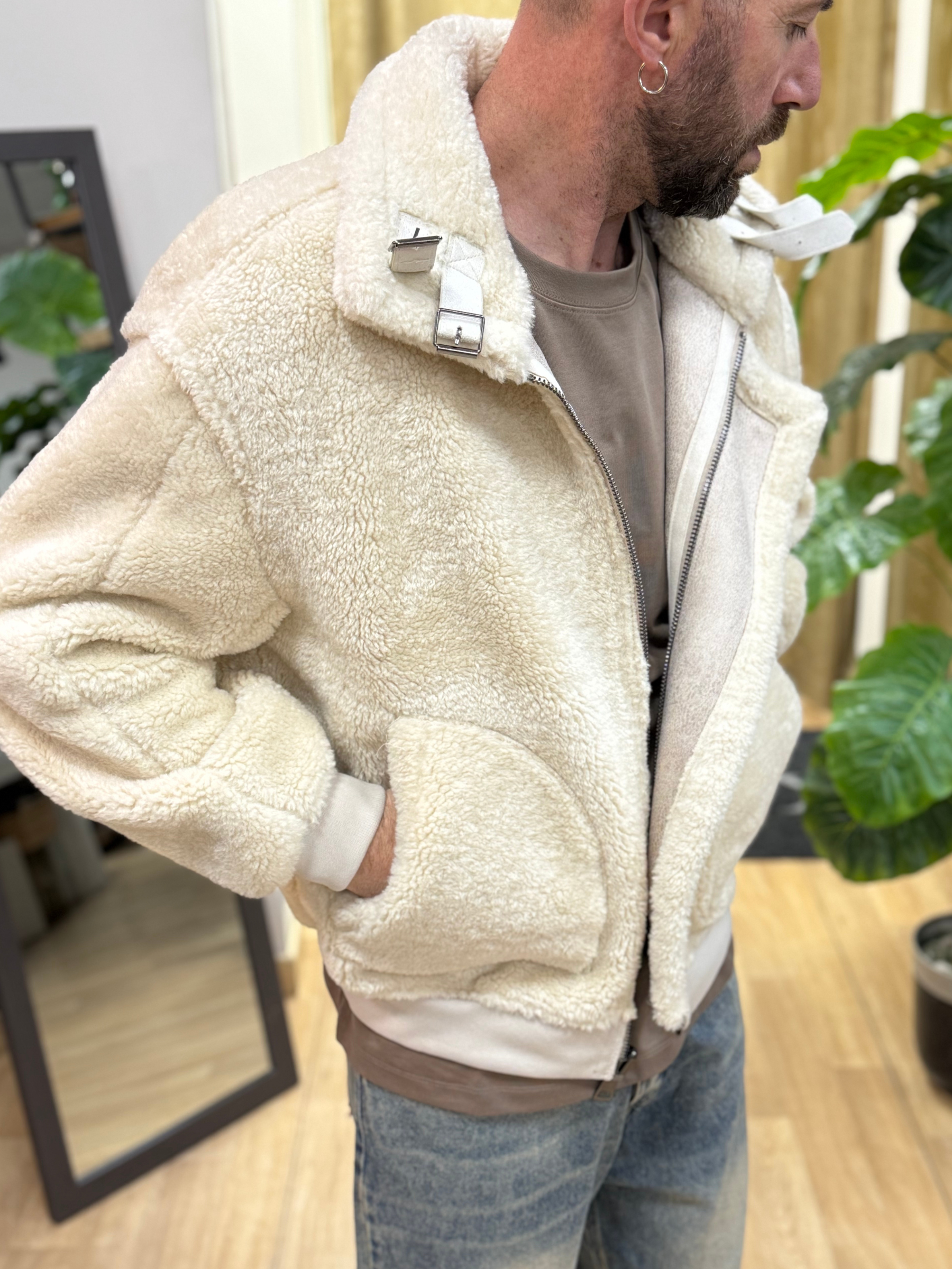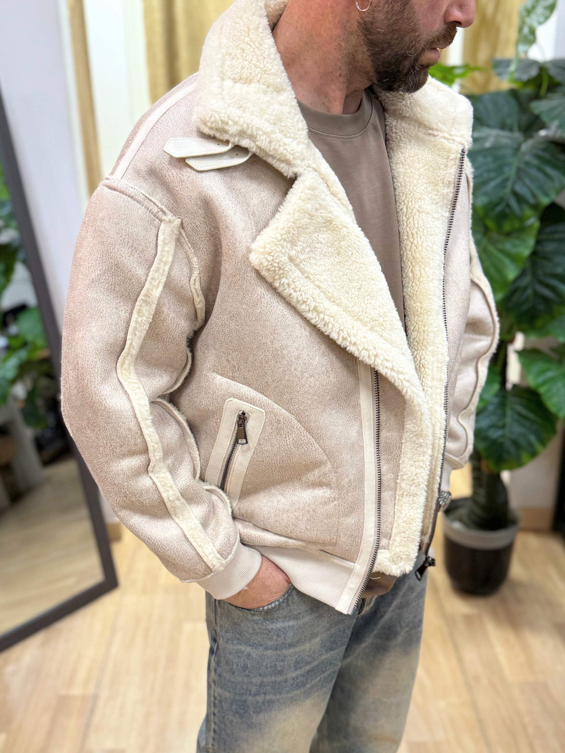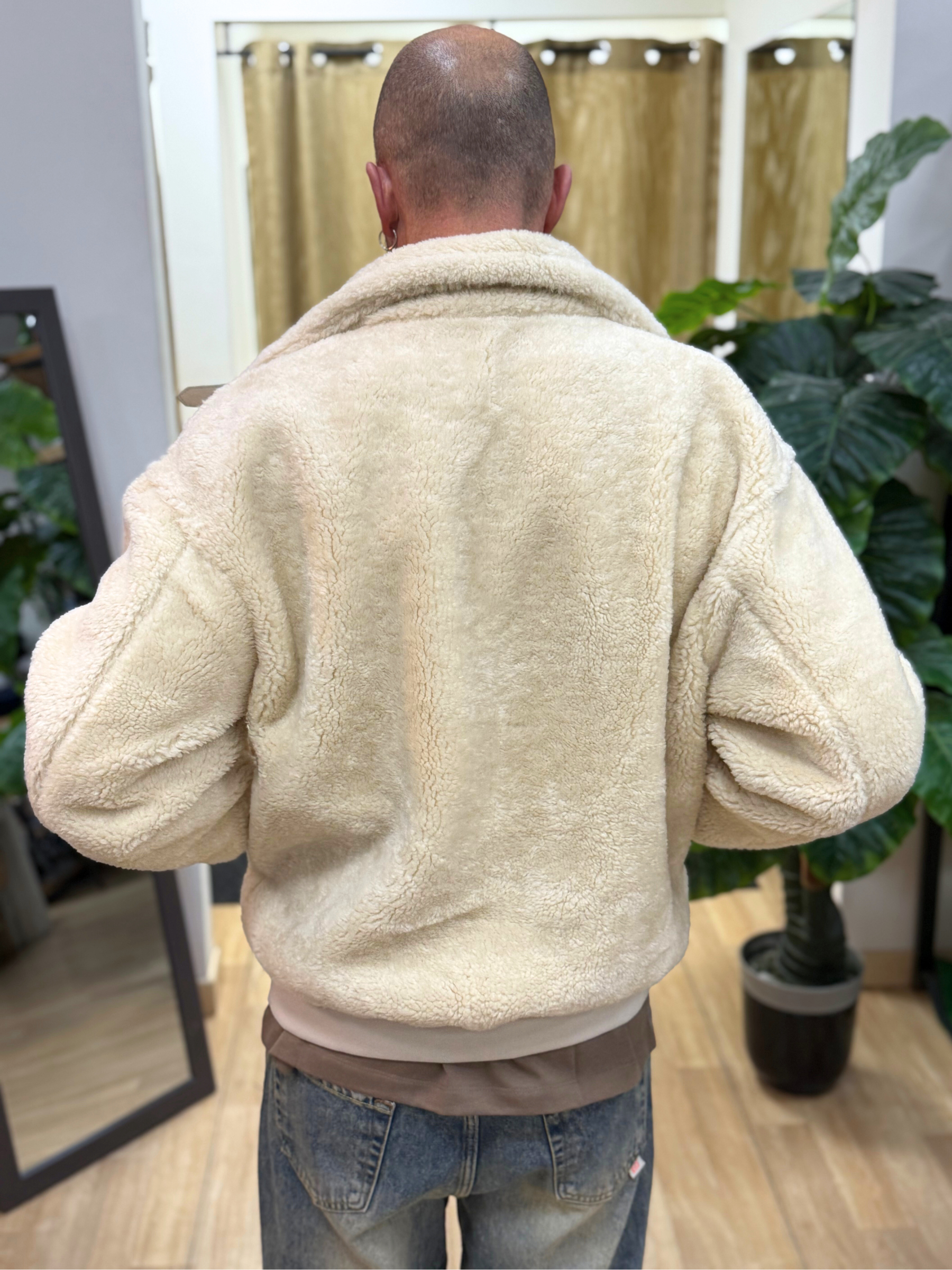 Giacca montone reversibile in eco shearling effetto suede da un lato e teddy effetto pelliccia dall'altro.