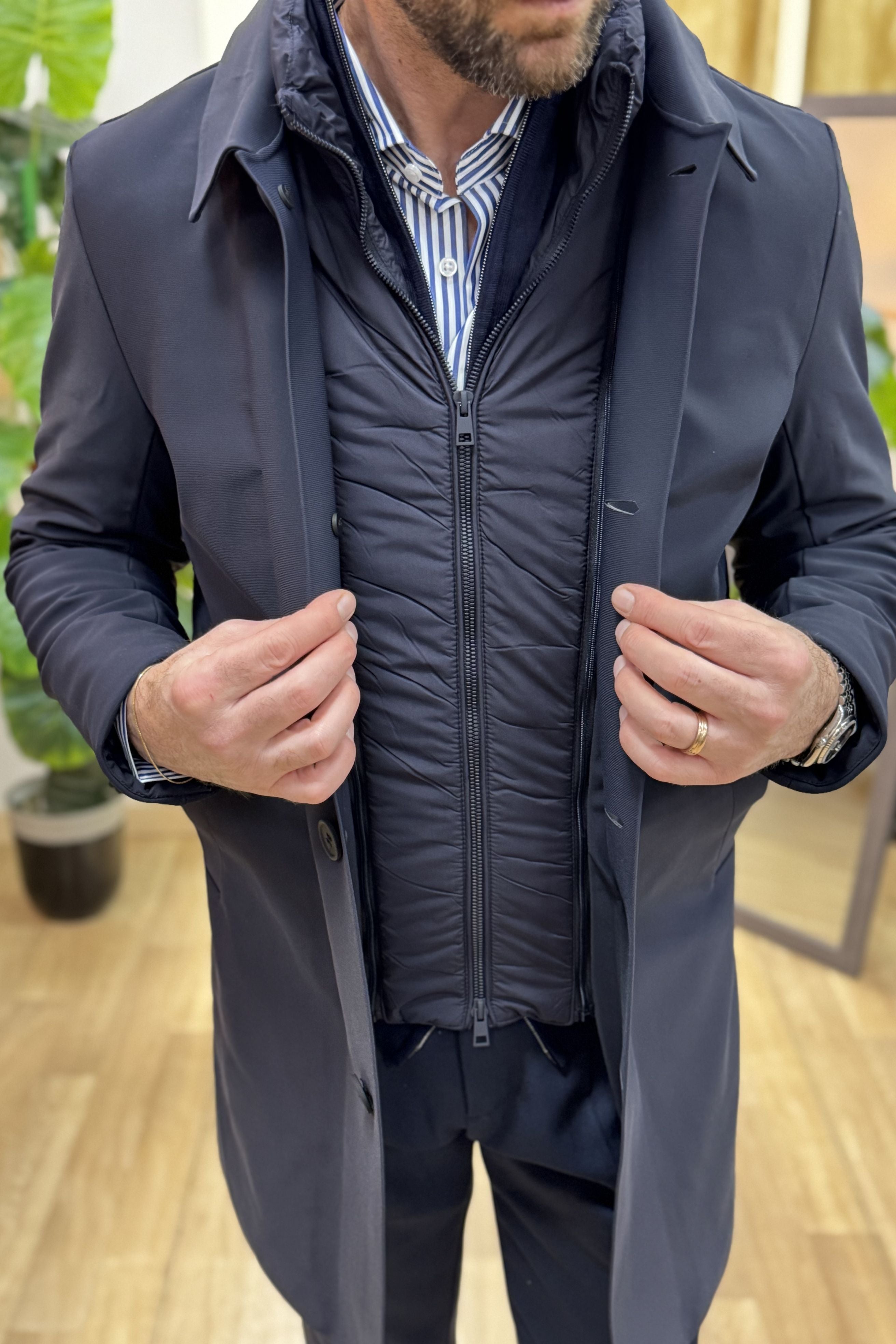 - Il modello in foto indossa una taglia 50, è alto 1.86 e pesa 84kg;