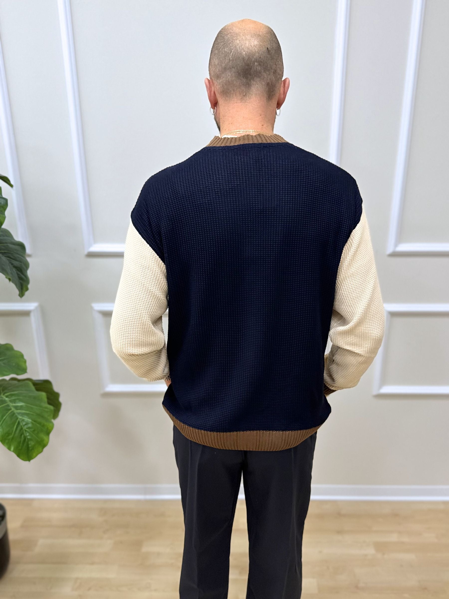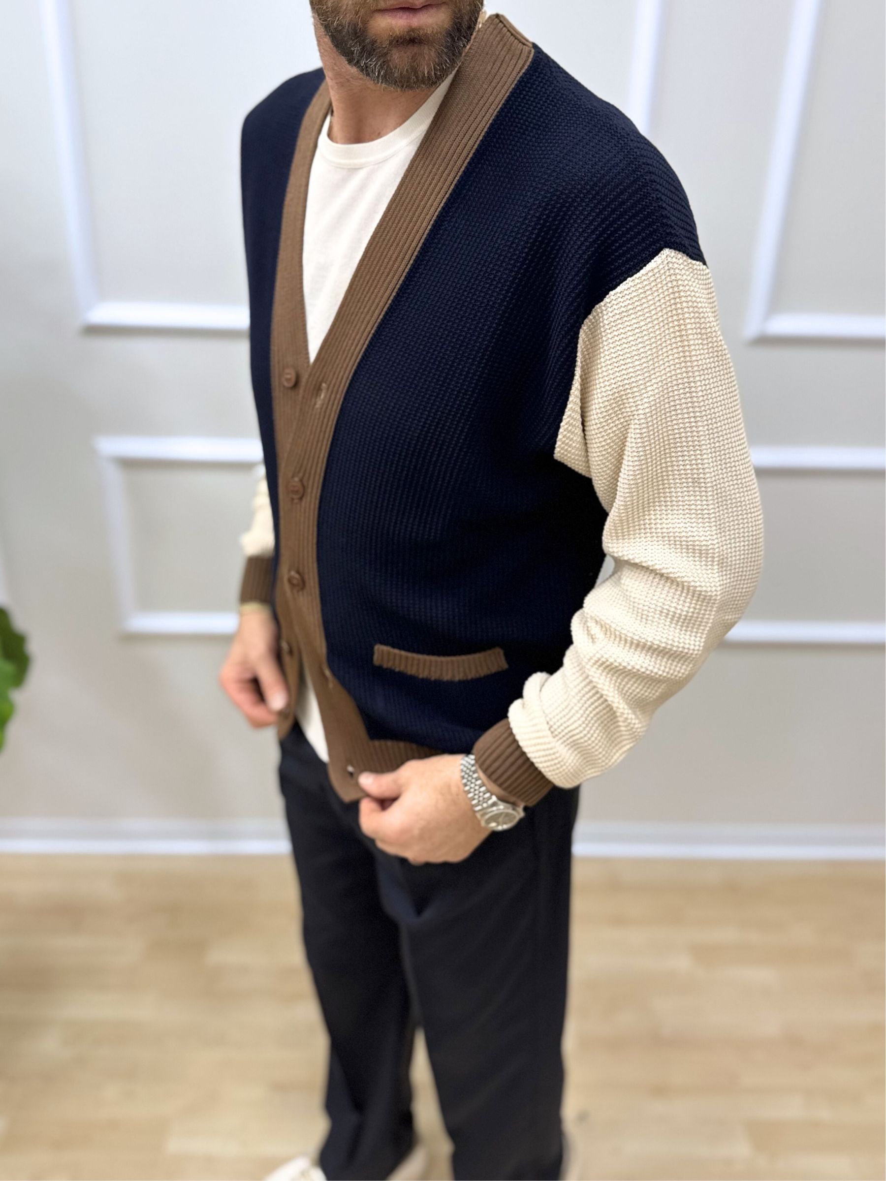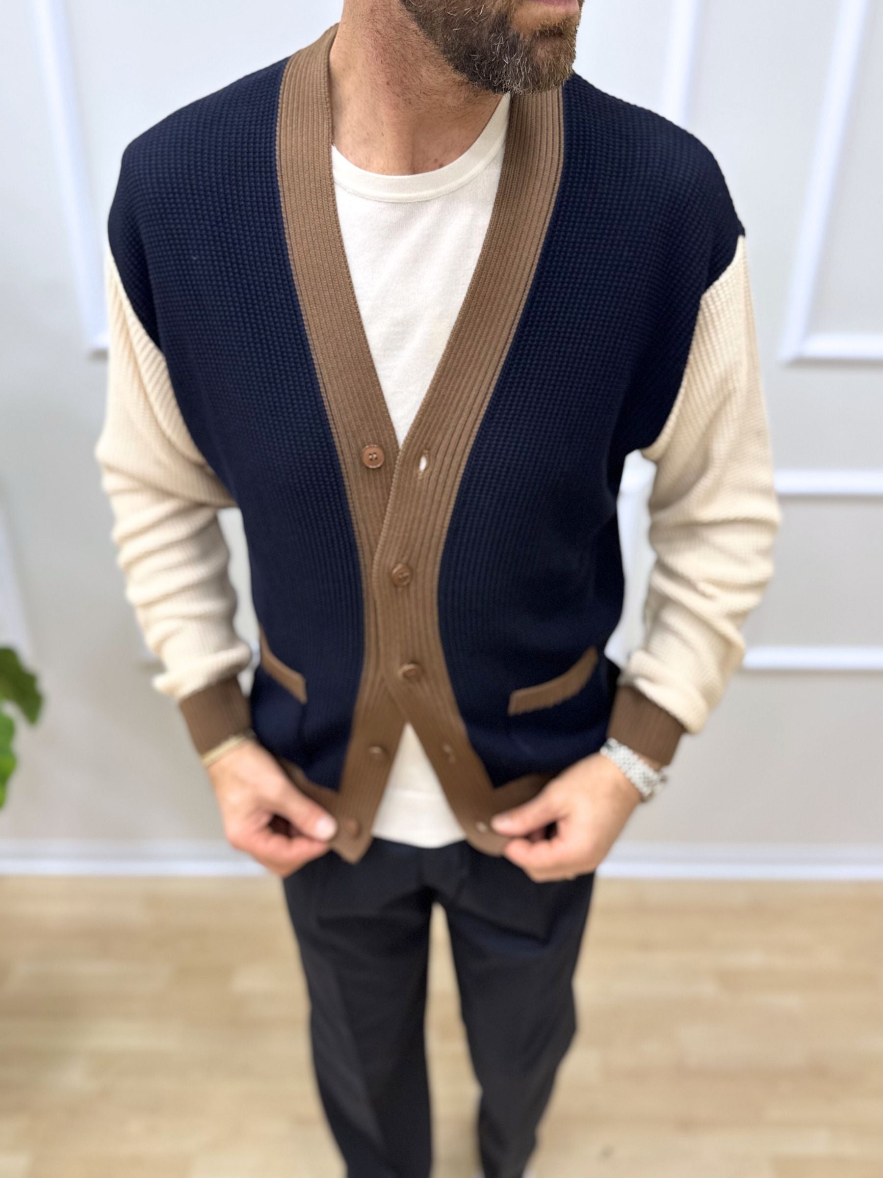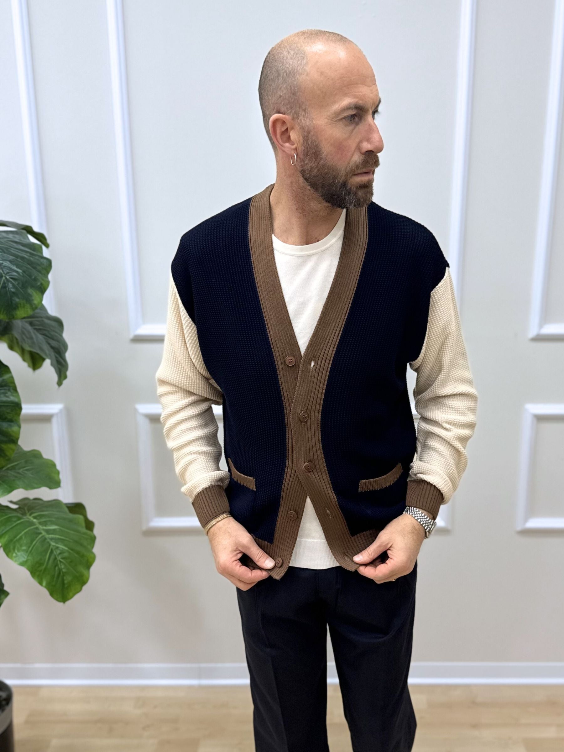 Colore: Blu con dettagli e profili a contrasto marrone e maniche beige